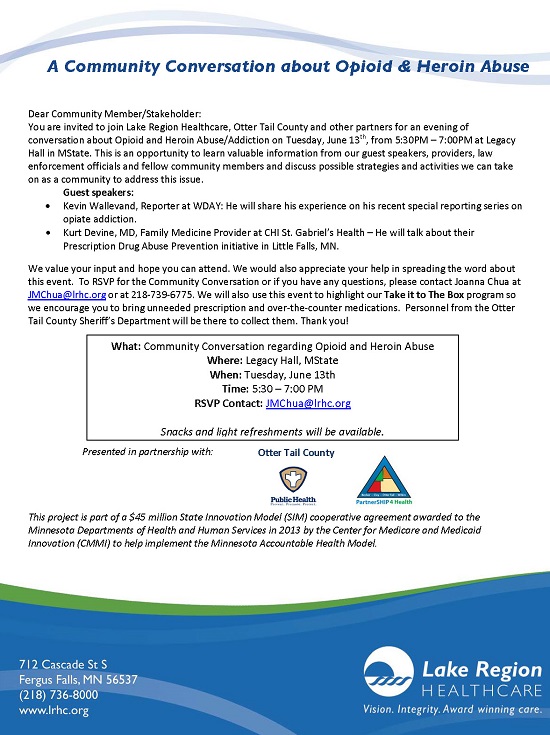 You are invited to join Lake Region Healthcare, Otter Tail County and other partners for an evening of conversation about Opioid and Heroin Abuse/Addiction on Tuesday, June 13th, from 5:30PM – 7:00PM at Legacy Hall in MState. This is an opportunity to learn valuable information from our guest speakers, providers, law enforcement officials and fellow community members and discuss possible strategies and activities we can take on as a community to address this issue.
