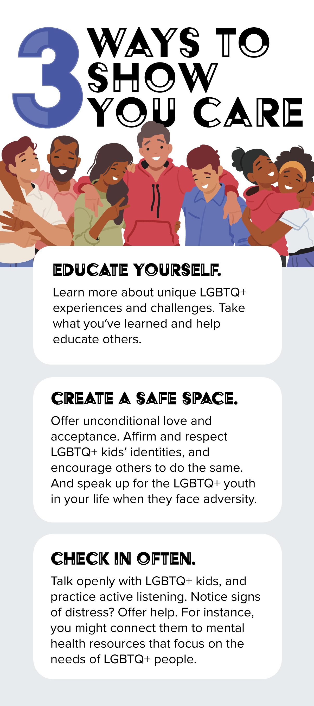 Offer unconditional love and acceptance. Affirm and respect LGBTQ+ kids' identities, and encourage others to do the same. And speak up for the LGBTQ+ youth in your life when they face adversity.